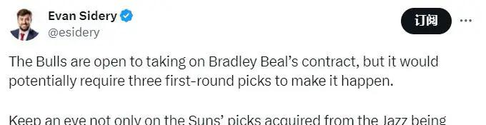 随后,另一位记者Sidery跟进报道证实了这一消息,并补充了交易细节:公牛对得到比尔持开放态度,但他们希望太阳队至少提供三个首轮签作为回报。这其中不仅包括太阳队从犹他爵士队获得的首轮签,更有可能包括密尔沃基雄鹿队2031年的首轮签。这显示出公牛对这笔交易的决心以及对比尔实力的认可。