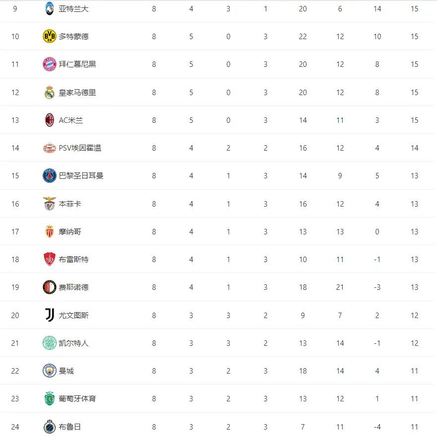今天凌晨,欧冠小组赛第8轮全部战罢,阿森纳、国米、马竞、勒沃库森赢球后确保前8名,AC米兰和亚特兰大掉出了前8名,阿斯顿维拉和里尔赢球后反超进入前8名,锁定淘汰赛资格。曼城和大巴黎搭上了附加赛的末班车,成功闯进了附加赛,曼城主场3-1逆转布鲁日,巴黎客场4-1大胜斯图加特,成功闯进了附加赛。