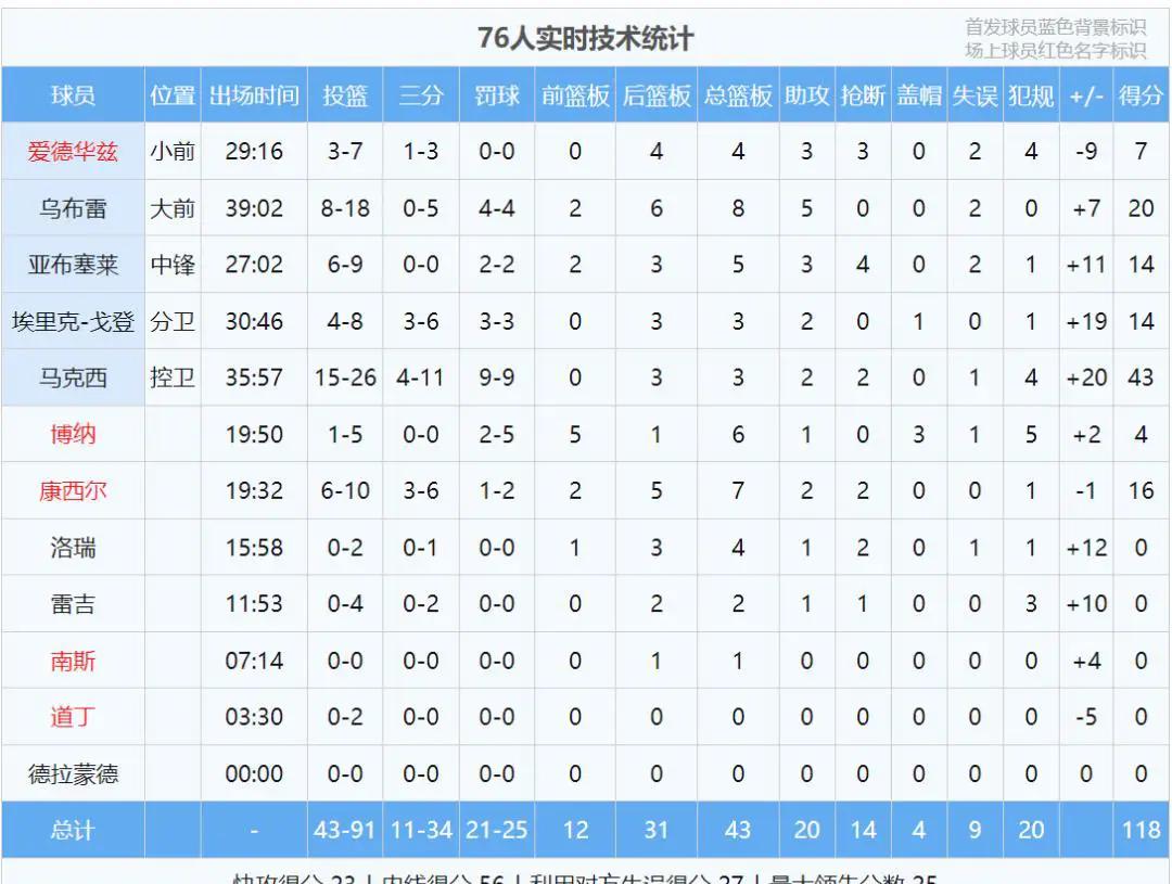 布朗尼单防马克西的效果并不好,后者凭借着出色的发挥开始了疯狂得分模式,湖人再怎么夹击已经太晚了。马克西今天首发出场36分钟,投篮命中率达到57.7%,三分球命中率为36.4%,罚球全中。他狂砍43分,同时还贡献了3个篮板、2次助攻和2次抢断,正负值+20,全场最高!即便乔治和恩比德缺阵,马克西一人就能够击溃湖人全队。