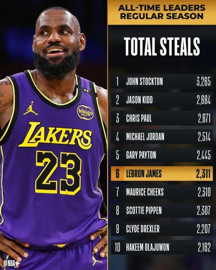 上半场比赛,两队在首节战的旗鼓相当,但对于湖人来说有一件不好的消息,那就是队内中锋安东尼-戴维斯因为腹部肌肉拉伤早早退场,湖人只能依靠詹姆斯,他上半场轰下12分5篮板7助攻1抢断的全能数据,但依旧无法拯救场上形势,湖人很快就落后两位数,半场更是落后16分!在拿下1次抢断后,詹姆斯生涯抢断数超越奇克斯成为来到NBA历史第6位,可以看出詹姆斯这条历史上最长的河依旧淌淌不息!