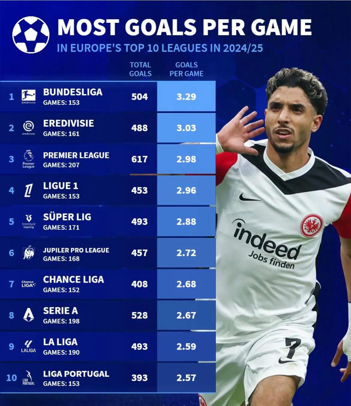 - 德甲(Bundesliga):总进球数504,场均3.29个进球,排名第一。