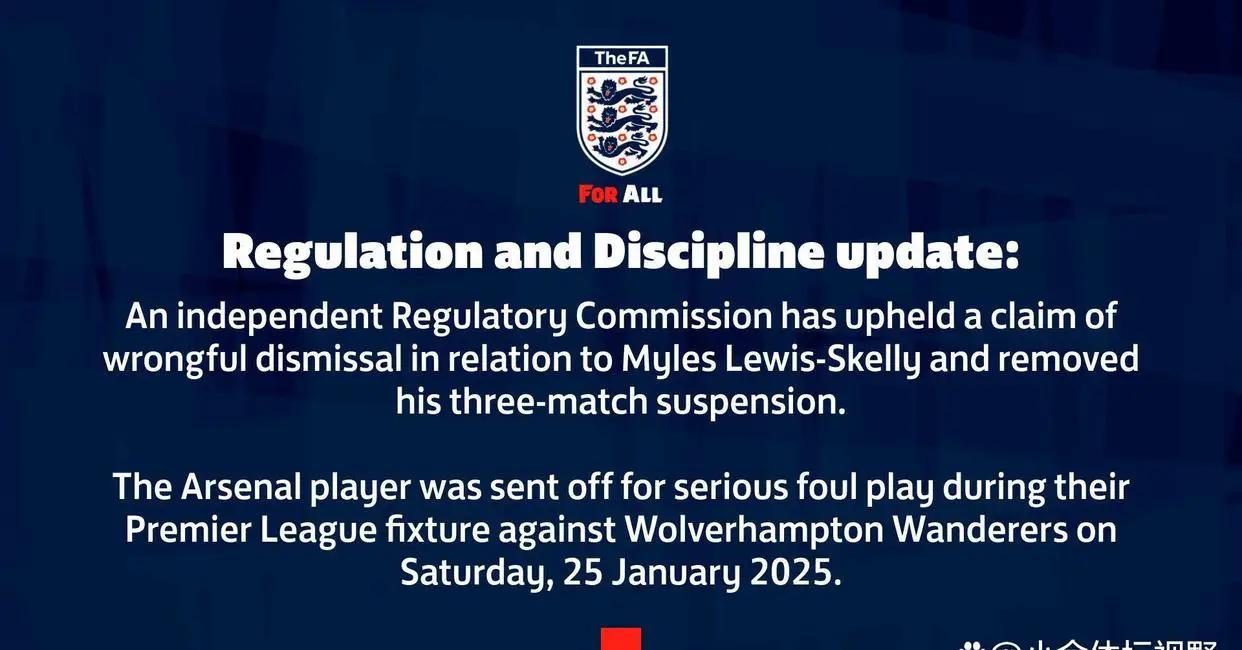 在独立监管委员会的审查后,英足总宣布阿森纳上诉成功,斯凯利的红牌被撤销,同时三场禁赛也被取消。英足总在官方通告中表示:“独立监管委员会认为对斯凯利的红牌判罚是错误的,并取消了他的三场停赛处罚。” 这对阿森纳是个重大胜利,斯凯利可以立即复出参加接下来的比赛。这一事件也再次引发了对英超裁判标准的广泛讨论。