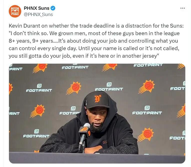 赛后,杜兰特被问及即将到来的交易截止日是否会让自己分心。