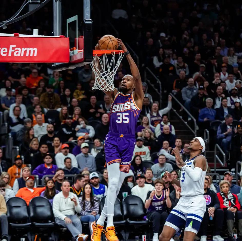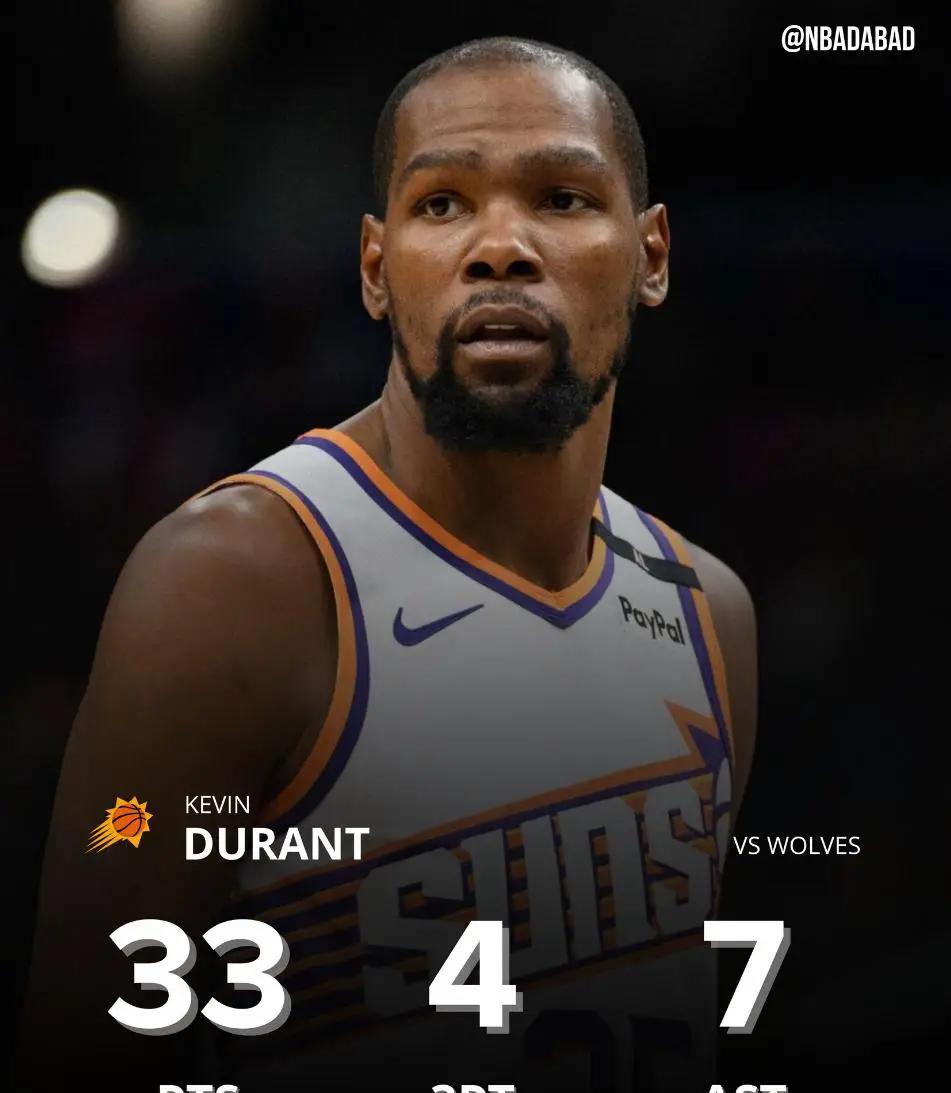 在比赛中,菲尼克斯太阳上半场领先明尼苏达森林狼12分,但最终被逆转。第三节,太阳本以为引以为傲的进攻只得18分,末节双方进行激烈对攻,却最终净负4分。杜兰特独得33分和7次助攻。
