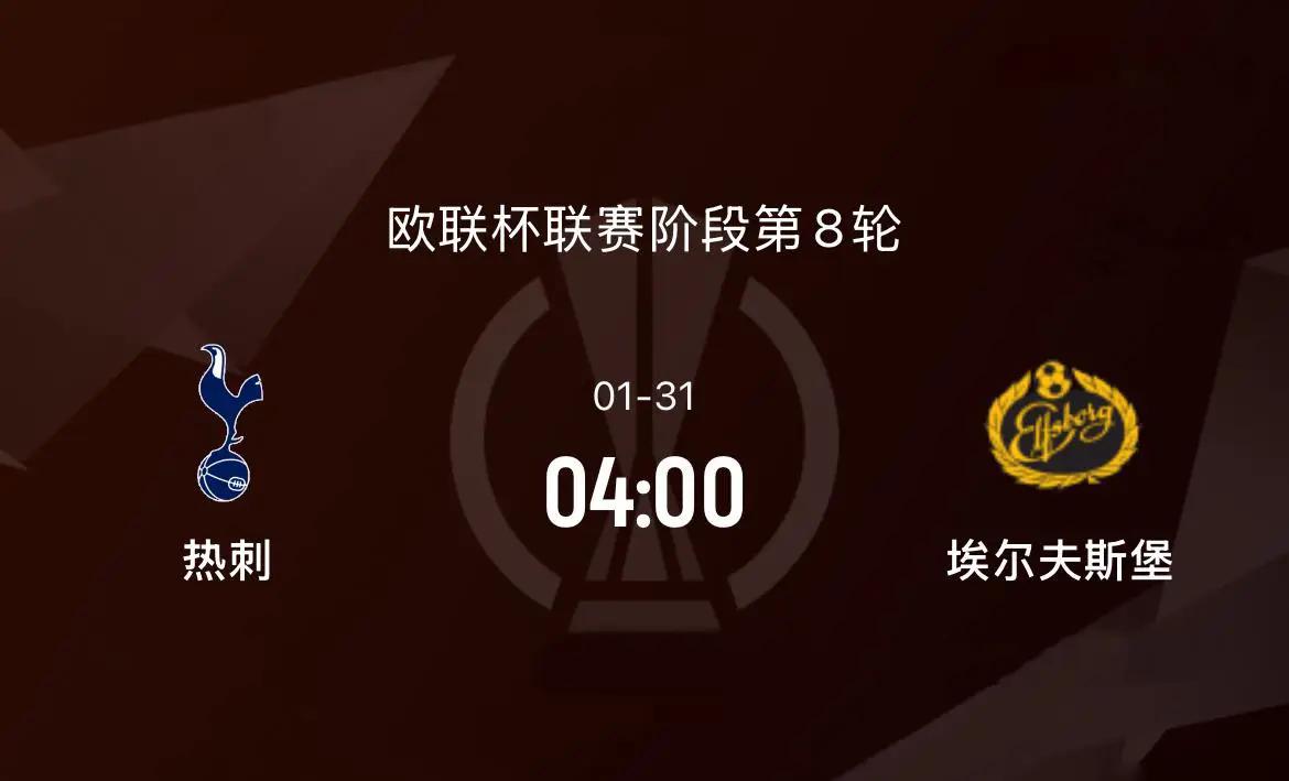 热刺与埃尔夫斯堡的比赛即将到来,这场欧联杯第八轮比赛将于1月31日4:00举行。