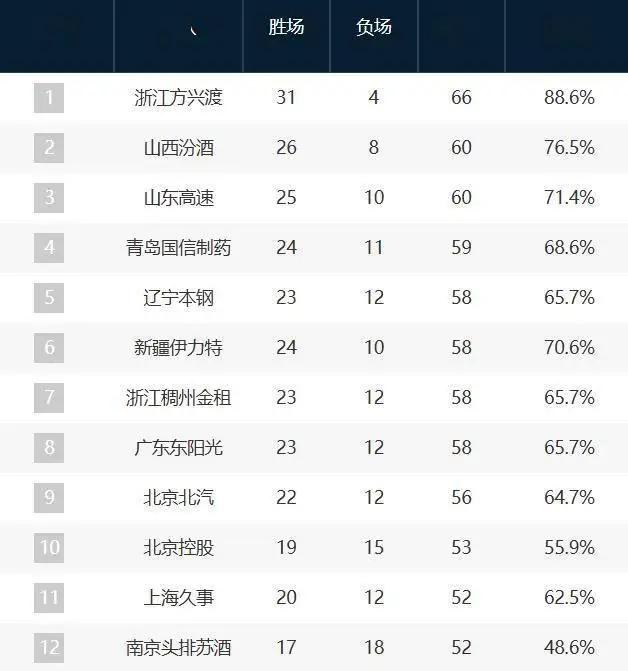5到8名分别是辽宁、新疆、浙江、广东。北京双雄经过一番挣扎,竟然排名就靠在了一起,分别在第9和第10,有点难兄难弟的味道。当然,北汽队拿到22场胜利,比北控的19场还是有挺大优势的。11和12分别是上海和南京。