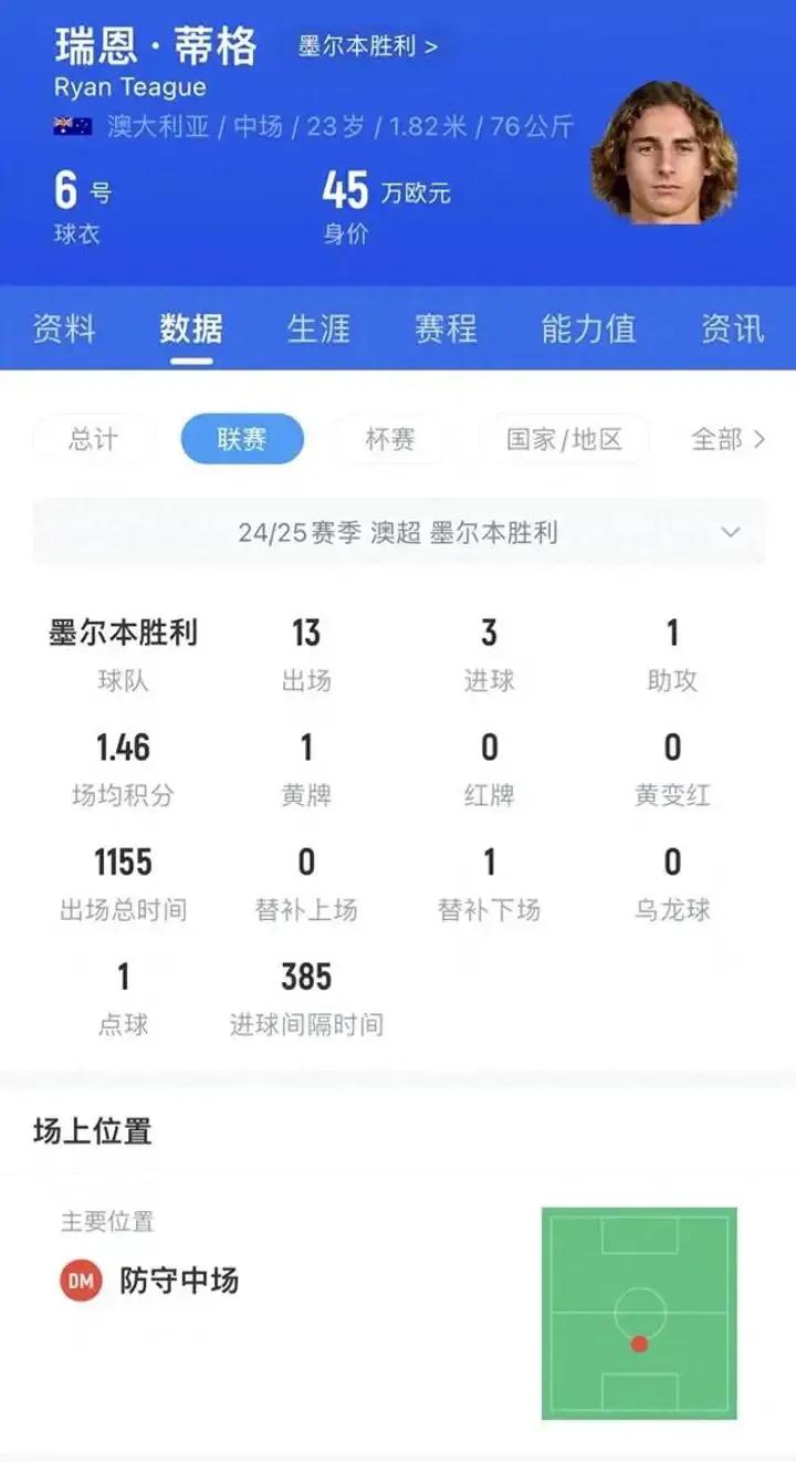 本赛季,他代表墨尔本胜利出战13次,打进3球,身价在德国《转会市场》达到45万欧元。这数据可不是吹的,说明这哥们儿确实有两把刷子。