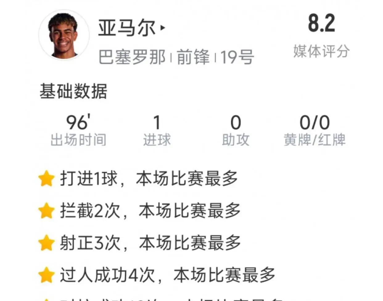 比赛结束后的数据统计显示,亚马尔首发出场89分钟,射门6次命中3次,创造1次进球机会并攻入1球,过人5次成功4次,对抗13次成功10次,抢断1次,拦截2次,全场评分8.2,仅次于拉菲尼亚。然而,官方评选他为全场最佳球员。
