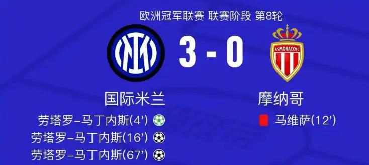 北京时间今天凌晨,欧冠联赛第8轮同时进行,国际米兰在主场梅阿查球场迎战摩纳哥。本场比赛只需平局,国米就能成功晋级欧冠8强,最终他们以3-0的大比分胜出,成功晋级8强。