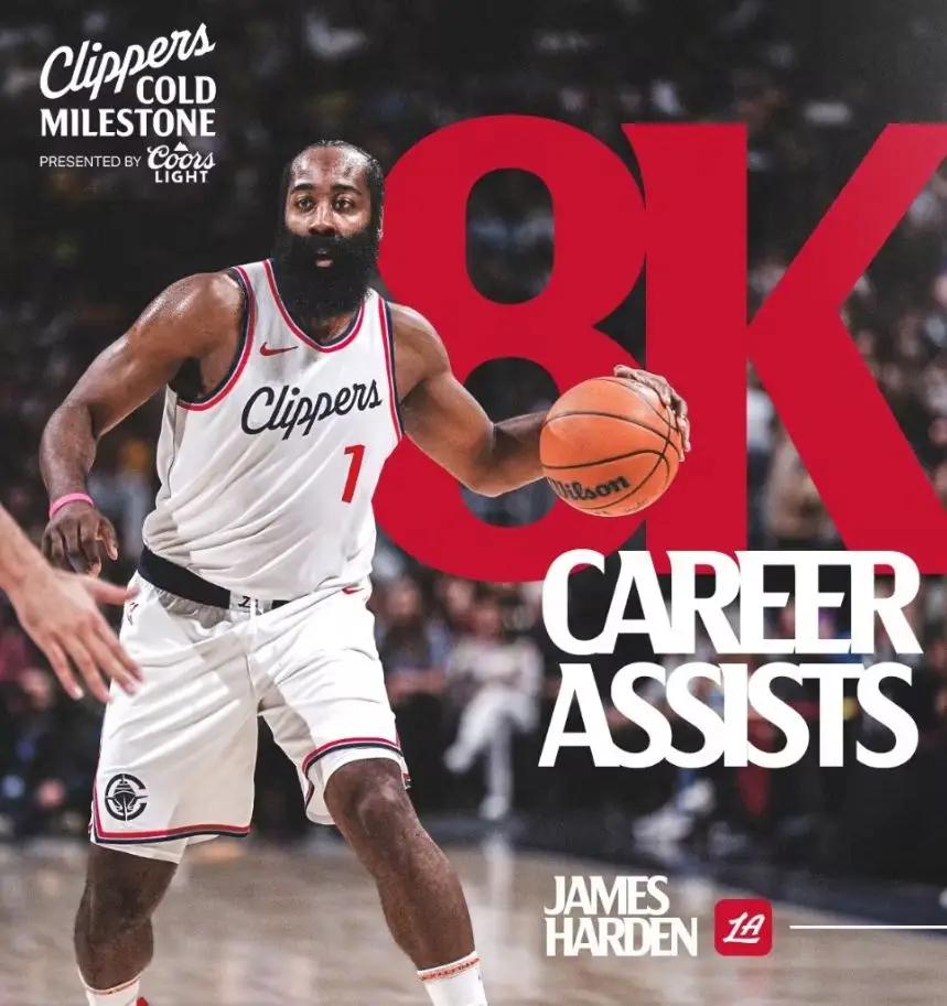 在北京时间 2 月 1 日的 NBA 常规赛中,洛杉矶快船在客场以 112 - 104 击败夏洛特黄蜂,成功收获两连胜。此役,快船的哈登迎来了里程碑之夜,达成了生涯常规赛 8000 次助攻的壮举,成为 NBA 历史上第二快达到 26000 分 + 8000 助攻 + 6000 篮板的球员,尽管他的手感在这场比赛中有些 “迷失”,12 投 4 中,三分球 6 投 1 中。