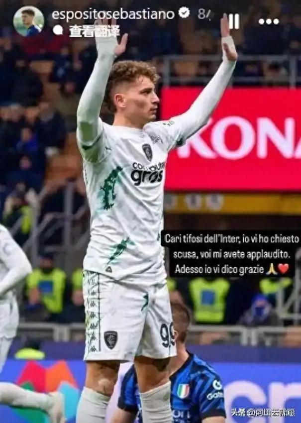 在上轮意甲联赛国米主场对阵恩波利的比赛中,被租借到恩波利的埃斯波西托攻破了国米的大门。进球后的他没有庆祝,而是立马双手合十向北看台的国米死忠致以歉意。赛后,他还在个人社交媒体上向蓝黑球迷道歉并致谢。这一武术足以证明,国米在他心中有着真实的地位。但这个进球,对于国米来说,却仿佛是一记刺痛内心的针。