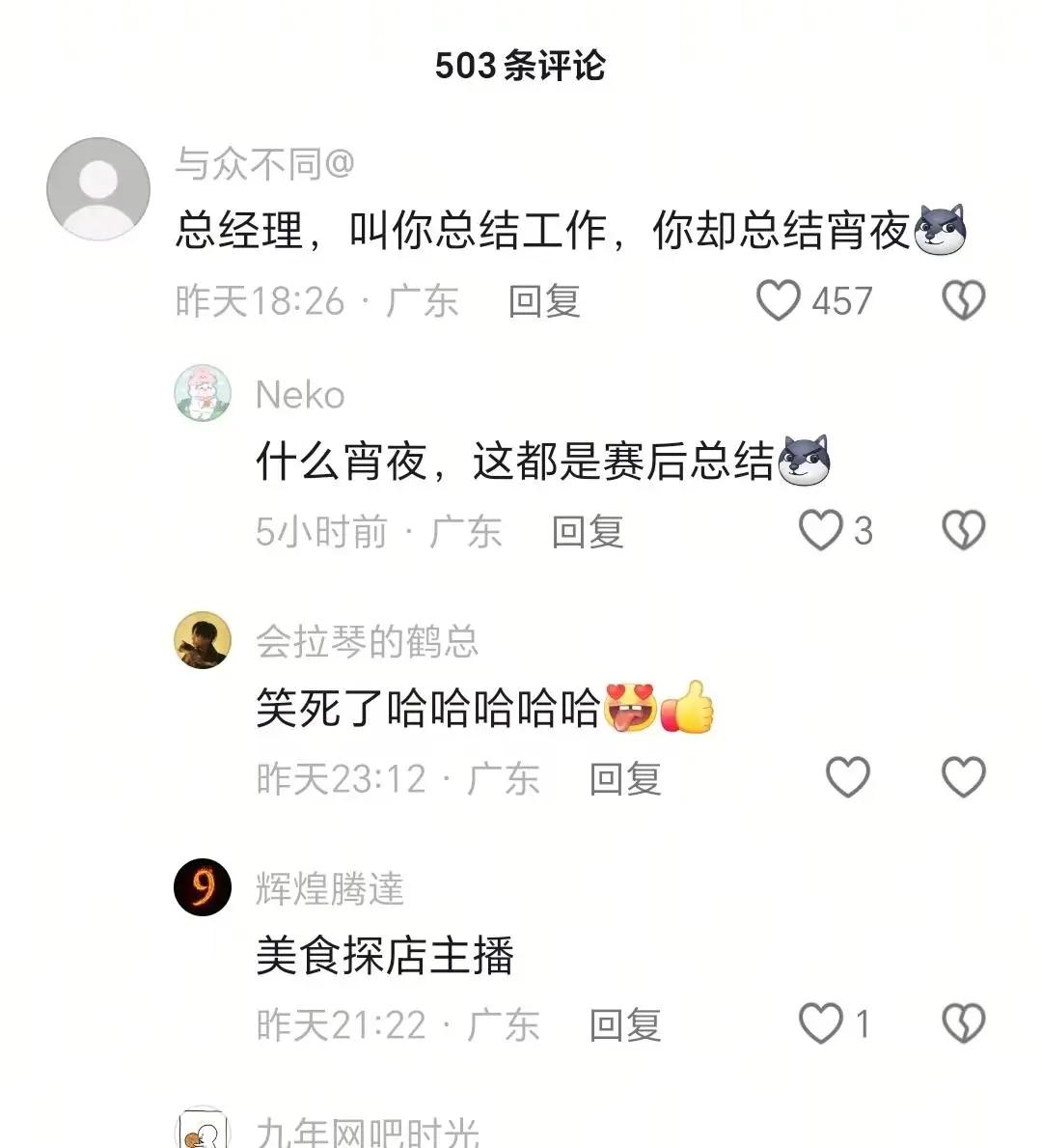 这是多么的荒唐啊,作为一个总经理不去好好总结年度工作,而是向公众和所有网民去总结他喝啤酒和吃烧烤。他总结道:“2024年里,我一共在11个城市吃了23顿宵夜,点了15箱啤酒,最终只喝了24瓶,退了163瓶,感谢老板们对我的包容”。