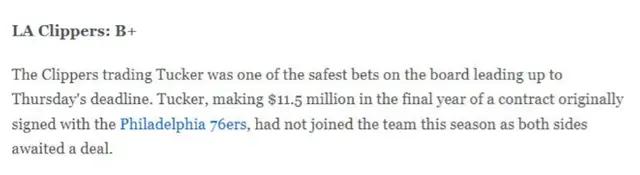 从快船的角度看,这笔交易是他们在交易截止日前采取的一个相对稳健的决定。塔克的合同最后一年价值1150万,而他本赛季几乎没有出现在球队阵容中。因此,交易塔克对于快船来说并非意外,反而是一个理智的举动。塔克的离队不仅减轻了球队薪资负担,也使得他们有更大的灵活性进行未来的交易操作。