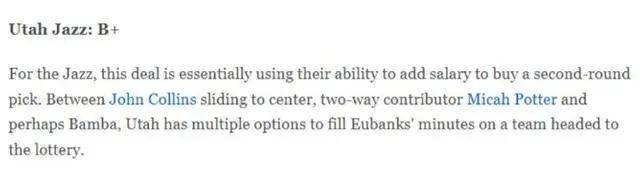 整体来看,这笔4换2的交易对于两支球队来说都有其独特的价值和意义。快船通过清理薪资、补强内线深度并且为未来提供了更多的灵活性,可以说是这一交易的最大受益者。尤班克斯的到来为快船提供了更多的替补深度,而米尔斯则能够为球队带来经验和冷静。至于爵士,这笔交易是基于薪资清理和年轻球员培养的考虑。尽管失去了米尔斯的领导力,但他们得到了次轮选秀权,并且在内线补充了班巴,确保了球队的阵容深度。然而,塔克可能会被买断,这使得爵士这笔交易的长远影响还需时间来验证。