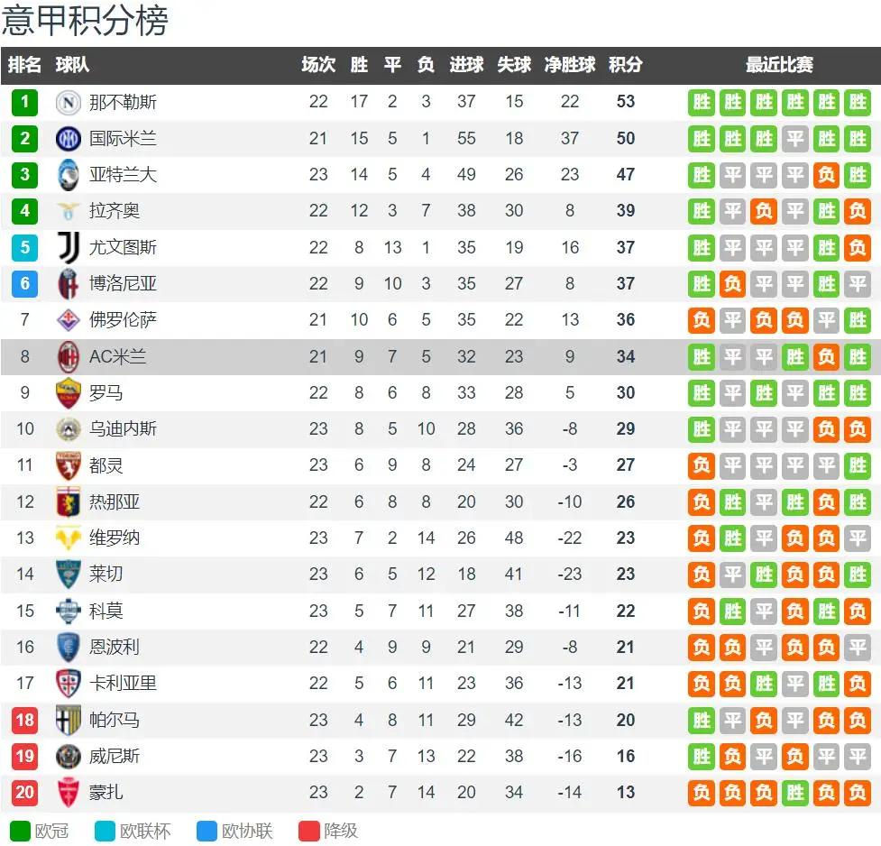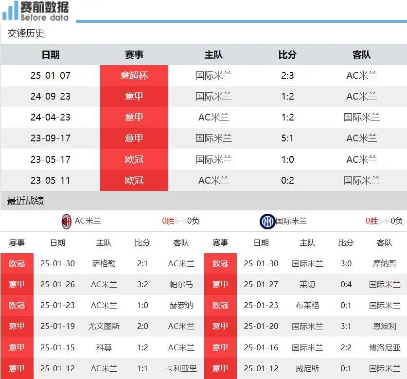 双方近6次交手,米兰2胜4负,处于下风。
