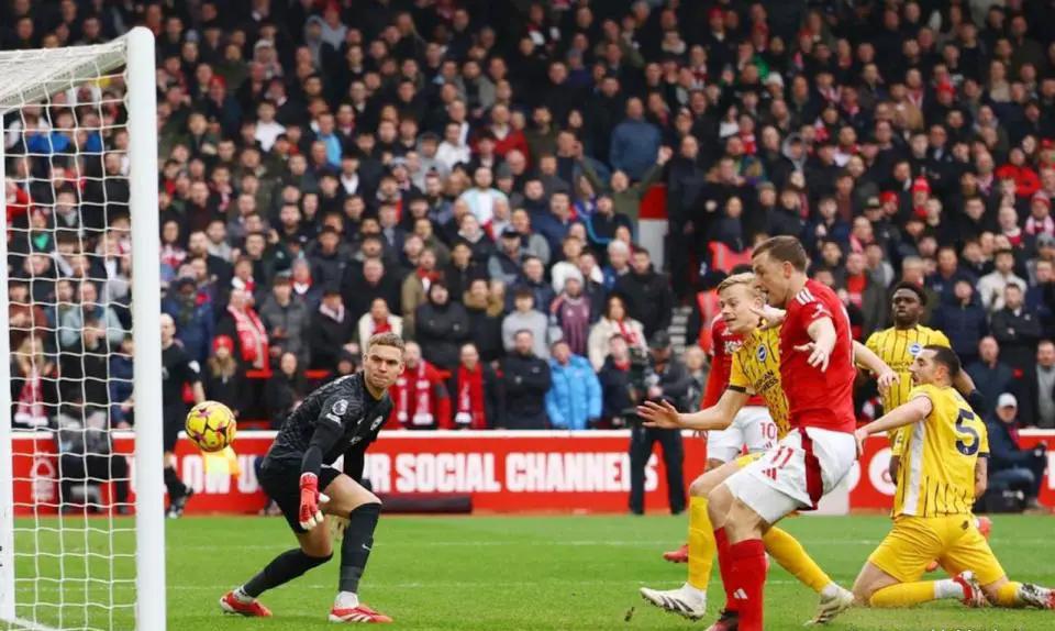 比赛拉开帷幕后,诺丁汉森林很快找到了状态。在第13分钟,吉布斯-怀特突破后传中,布莱顿球员不慎将球送入了自家球网,让诺丁汉森林1-0领先;仅6分钟后,埃兰加射门击中立柱,错失得分良机。随后,诺丁汉森林继续掌控比赛局势。第25分钟,埃兰加开出角球,吉布斯-怀特头球攻门得手,将比分扩大至2-0;5分钟后,主队再次攻门造成球碰撞立柱弹出。第33分钟,埃兰加精准传球,克里斯-伍德轻松破门,让诺丁汉森林3-0领先,埃兰加完成了助攻并展现出个人能力。