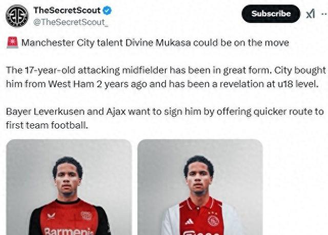 17岁的穆卡萨,如同一颗足球界的闪亮明珠横空出世。在曼城U18的赛场上,这名年轻的中场球员展现了超凡的潜力:12场比赛中斩获12球和12次助攻,完美的“12 12”的数据令人瞩目。而德国劲旅勒沃库森和荷兰豪门阿贾克斯的争相追逐,更让这一切看起来如天选之子的故事。