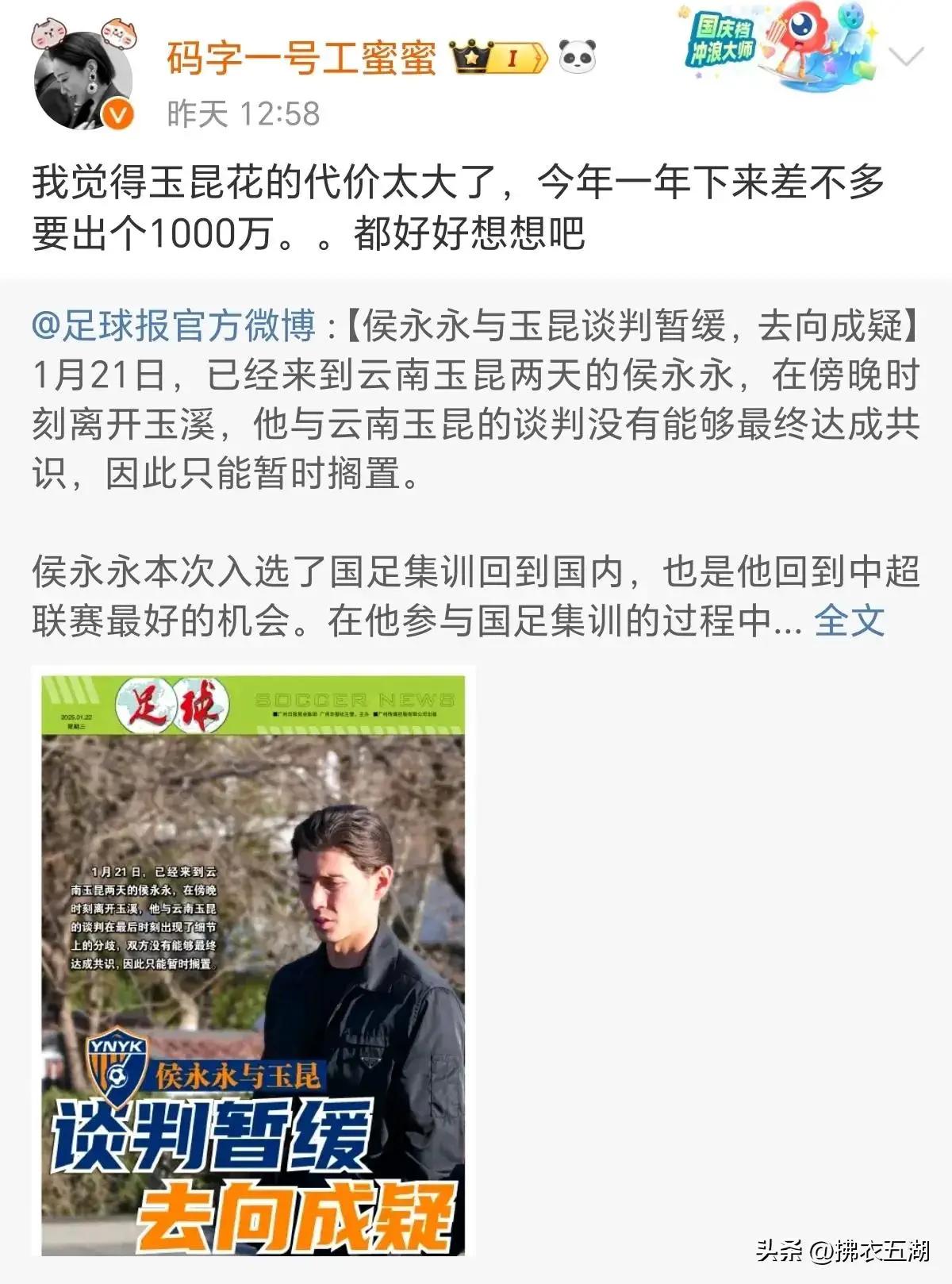 如果侯永永签约,云南玉昆将为侯永永花费约2380万人民币。但最终双方没能达成共识,最终只能暂时搁置。