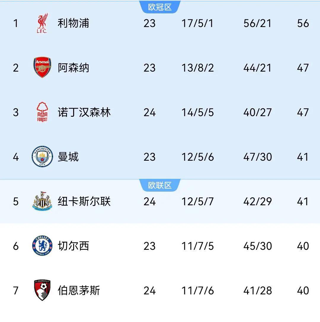 随着这场胜利,利物浦继续保持强势,连续三场胜利领跑英超积分榜。而在争四榜上,局势变得扑朔迷离,除了利物浦遥遥领先外,其他七支球队竞争激烈。枪手阿森纳、诺丁汉森林、曼城、纽卡斯尔联、切尔西、伯恩茅斯、阿斯顿维拉都在争夺前四名的席位,其中阿森纳与曼城的对决更是让英超争四格局彻底混乱。