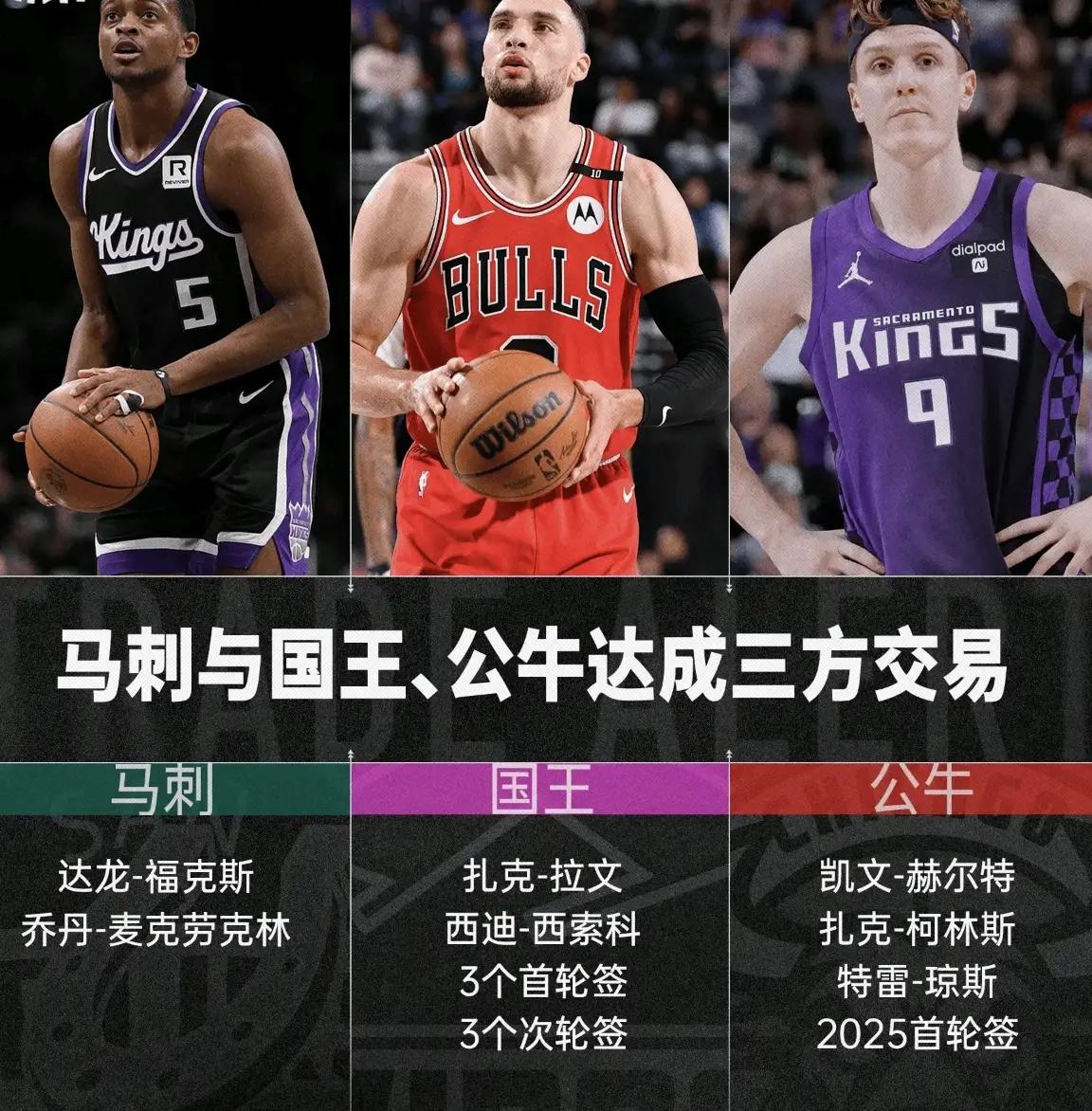 萨克拉门托国王:扎克拉文+西索科+3个未来首轮签(2025黄蜂、2027马刺、2031森林狼)+3个未来次轮签(2025公牛、2028掘金、2028国王(收回自己的次轮签));