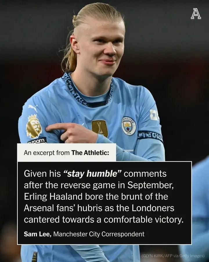 据The Athletic报道,在客场1-5不敌阿森纳后,哈兰德在赛后手指着代表英超冠军的金色臂章作为回应。此前,曼城实现了英超四连冠,而阿森纳已经多年未能染指英超冠军。