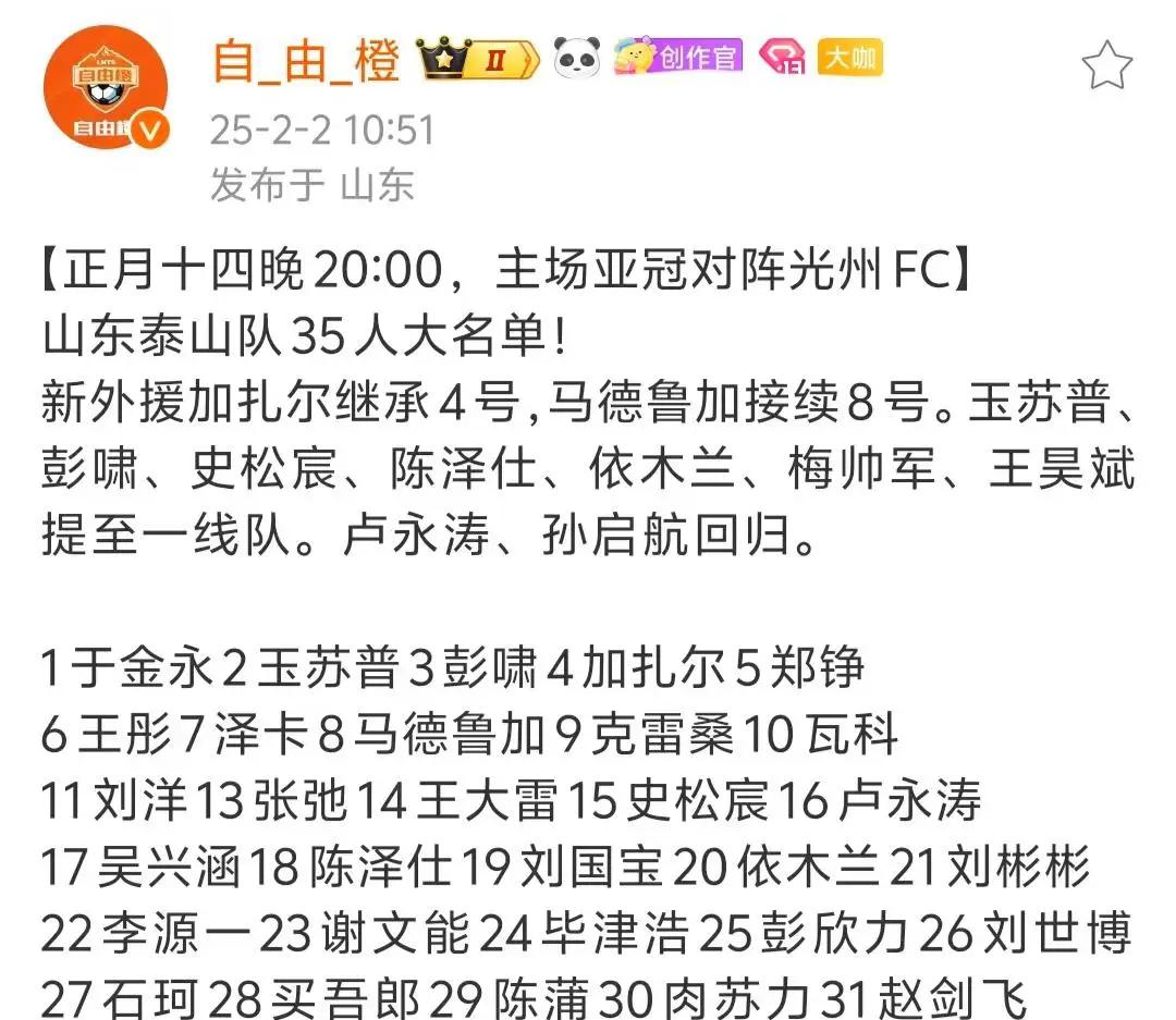 北京时间2月2日,距离山东泰山队在亚洲精英赛第7轮主场对阵光州队的比赛越来越近。根据亚足联的要求,泰山队提前15天完成了球员名单的更新工作。队伍撤下了离开的外援马赛尔,同时报名了新加入的外援马德鲁加和卡扎尔。从泰山队更新的亚冠球员名单中可以看到,球迷们对于卡扎尔穿着4号球衣、马德鲁加穿着8号球衣并不感到意外。他们接下来能否获得主教练崔康熙的信任和重用,成为泰山球迷关注的焦点。