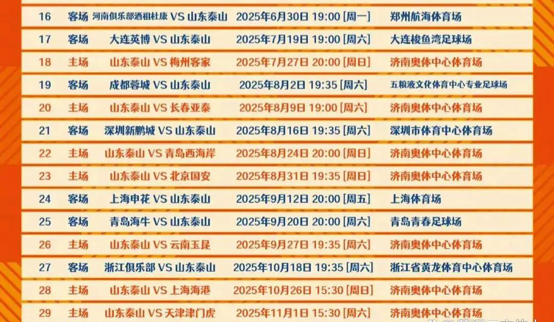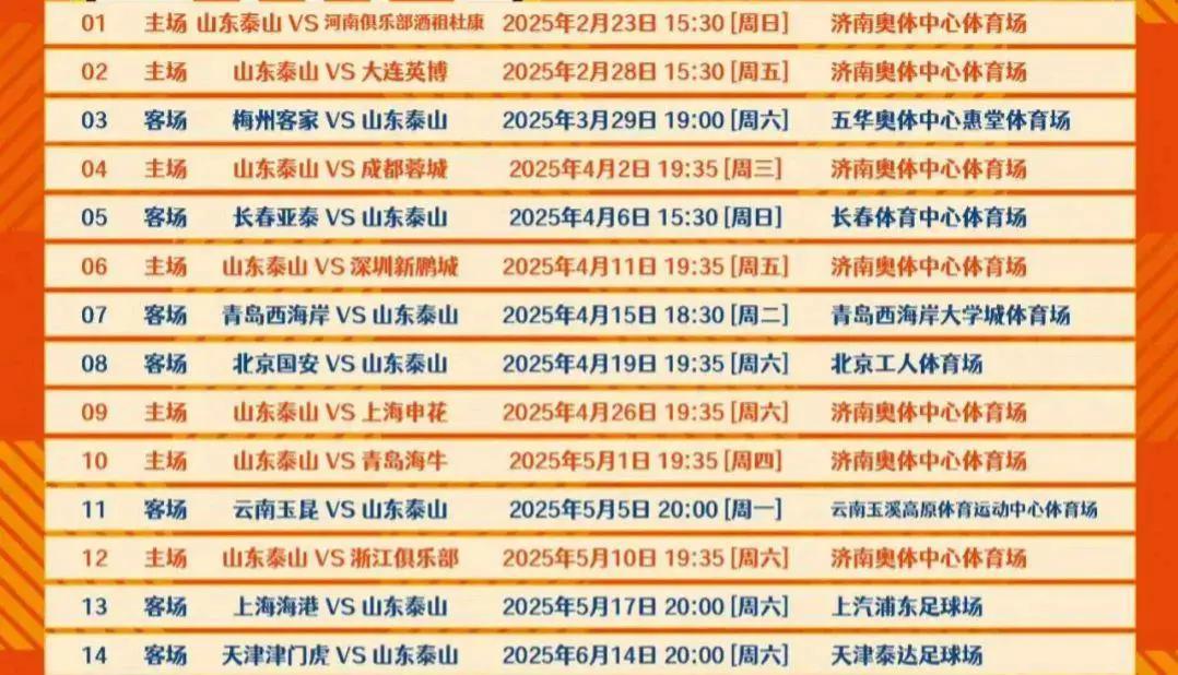 泰山队的新赛季赛程已经正式公布,共有30场比赛安排。他们将在2月23日下午15:30进行首场比赛,主场迎战河南队;而最后一场比赛则将于11月22日举行,作客挑战武汉队。