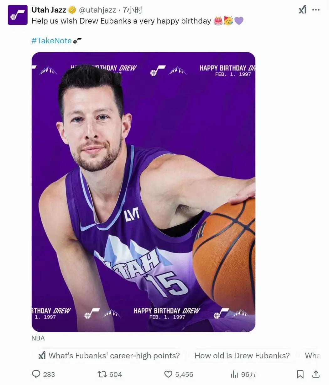 由于班巴指望不上,快船最近一直给祖巴茨寻找替补大中锋,现在尤班克斯来了!巧了么这不是?今天恰好是尤班克斯28岁的生日,交易之前半个小时,爵士官推刚给他送上生日祝福。交易达成之后,快船官推又给他说了生日快乐。