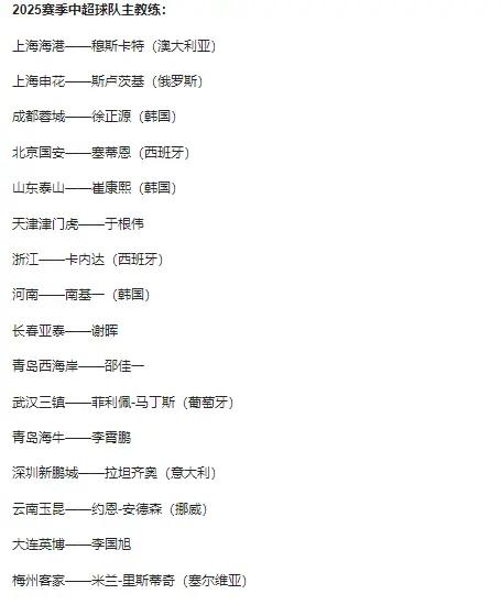 这里5人上榜,包括长春亚泰主帅谢晖、河南队主帅南基一、青岛海牛主帅李霄鹏、深圳新鹏城主帅拉坦齐奥、青岛西海岸主帅邵佳一。