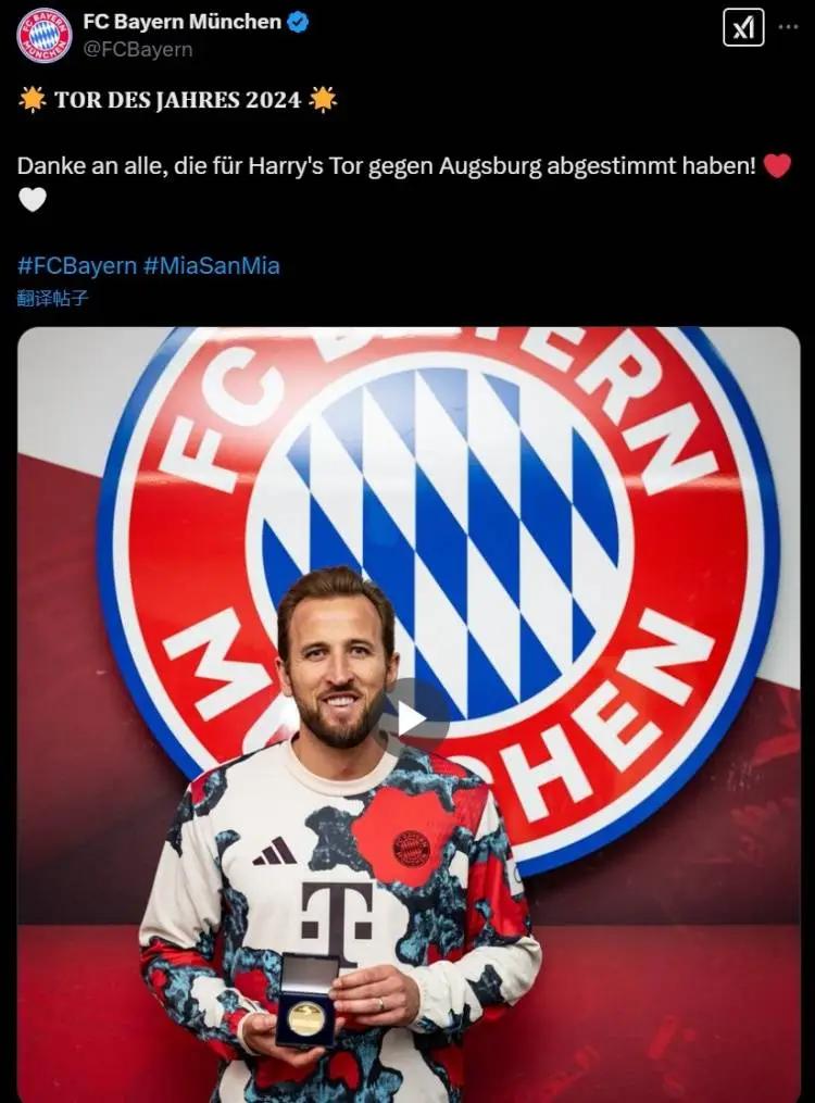 共计超过28万人参与投票,凯恩在11月对阵奥格斯堡的进球获得了约94000票,获得投票率达33.11%,也得以赢得了这一奖项。