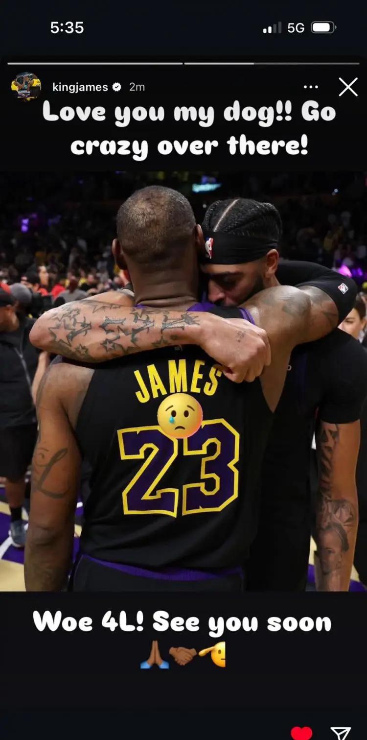 2月3日,洛杉矶湖人宣布与独行侠、爵士三方交易获得了独行侠的核心球员卢卡-东契奇。在浓眉被交易之后,詹姆斯在社交媒体上晒出一张与浓眉的合照,表达了对他的不舍和祝福。