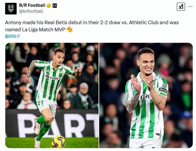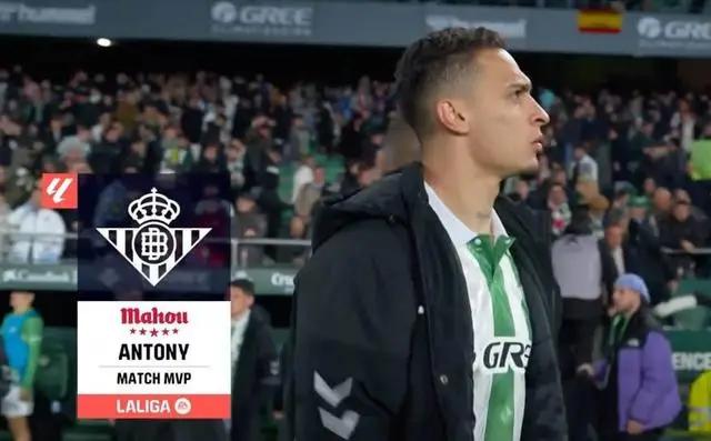 北京时间2月3日4点,24-25赛季西甲联赛第22轮,皇家贝蒂斯主场2-2战平毕尔巴鄂竞技。刚从曼联租借至贝蒂斯的安东尼首发出战,完成西甲首秀惊艳全场,成功当选MVP!