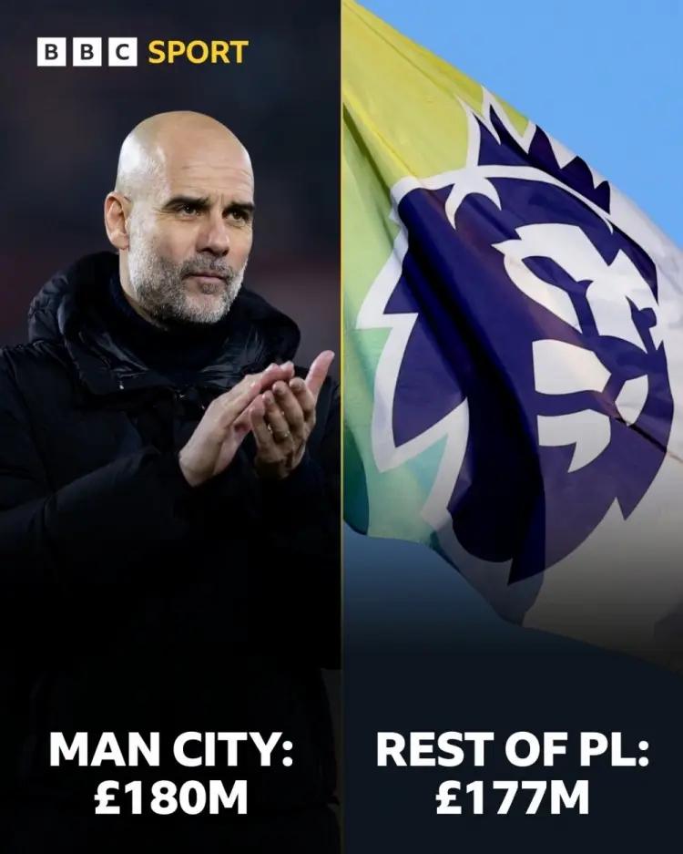 2月4日,据BBC统计,曼城冬窗引援花费的资金多于英超其余19队之和。