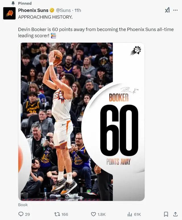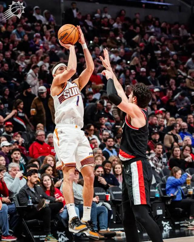 太阳官方继续预热德文-布克还差60分就成为队史得分王(此役后还差23分),背靠背第二场布克的得分势头还在延续,首节5中3拿到6分1篮板3助攻,三次得分都是来自中距离。