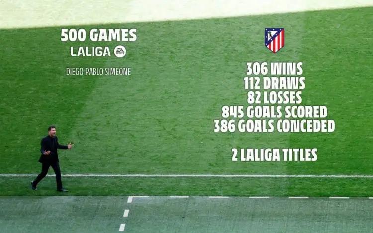据马竞统计,在这500场比赛中,西蒙尼收获了306胜112平82负的出色战绩,一共打进845球、丢掉386球。