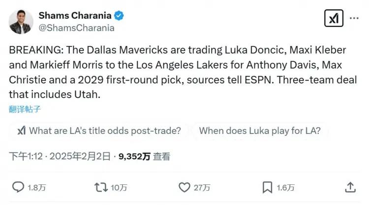 尽管NBA的交易截止日还没有来到,但独行侠管理层的操作已经惊艳整个联盟。率先报道这笔交易的名记Shams,仅仅用了不到两天的时间,那条关于交易的报道,成功为自己造势。爆料点赞超过27万,转发超过10万,均创个人纪录。然而,对于独行侠交易走25岁的卢卡东契奇的行为,彻底惹祸整个德州的球迷,他们不仅公然在社交媒体上怒批独行侠管理层,而且还上演了一出抬棺进场的“戏码”。不得不说,就连爵士总经理安吉那样深谋远虑的老角色,都没有看透交易的本质,还为洛杉矶湖人做了嫁衣,这样的举动还是引起外界的关注。