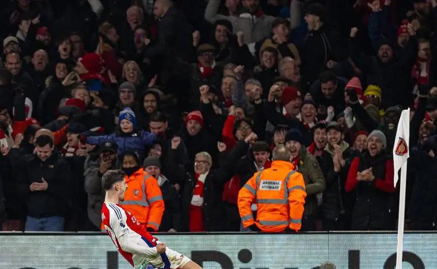 不到2分钟后,福登的传球失误被托马斯抢断,他大力射门,皮球打到斯通斯身上折射入网,2-1。再过5分钟,曾在首回合被哈兰德羞辱的斯凯利接到赖斯的传球,射入球门,3-1。斯凯利在进球后模仿哈兰德的庆祝动作,展示出自信的一面。10分钟后,备受批评的哈弗茨终于解脱,将球打进,酋长球场成为欢乐之地。