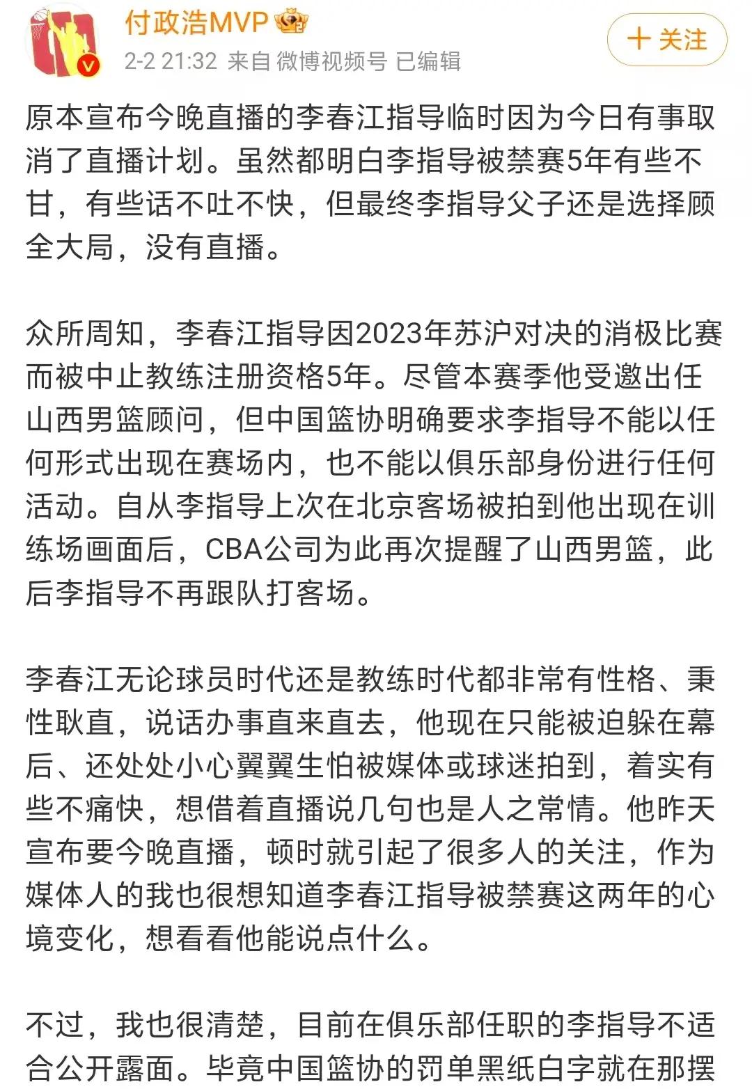 李春江指导为何要直播呢?或许名记付政浩的爆料是最好的答案,那就是CBA出手了,根据名记付政浩的爆料,因为此前对阵江苏男篮的消极,李春江指导被禁赛5年,本赛季,李春江指导出任了山西男篮的顾问,相对于李楠当时上任的轰轰烈烈,李春江在上任的指导闹出了不少争议,毕竟他的水平比李楠强太多了,最终,李春江指导上任的消息并没有得到太多的爆料,并且中国篮协明确要求李春江指导不能以任何形势出现在赛场内,也不能以俱乐部身份进行任何活动。