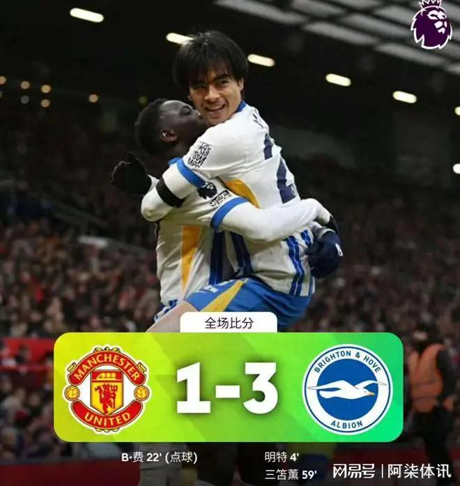 曼联近期状态起伏不定,他们既能赢下曼城、平利物浦,也能输给狼队,因此排名也一落千丈,现在排名已来到第13位。此役,曼联坐镇主场迎战布莱顿,上半场刚开始5分钟,曼联后防就遭遇暴击,布莱顿后场长传打身后,小日子球王三笘薰接球后横传中路,队友跟上破门;第22分钟,布莱顿送点,B费点射扳平比分;但谁也没想到,下半场风云突变,曼联判若两队,后防形同虚设,布莱顿抓住机会连进两球,最终布莱顿3-1完胜曼联。