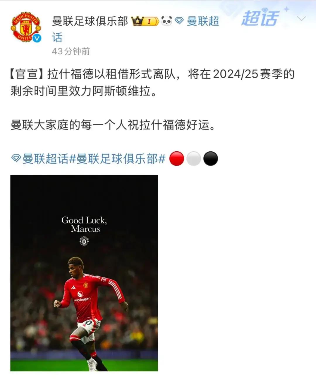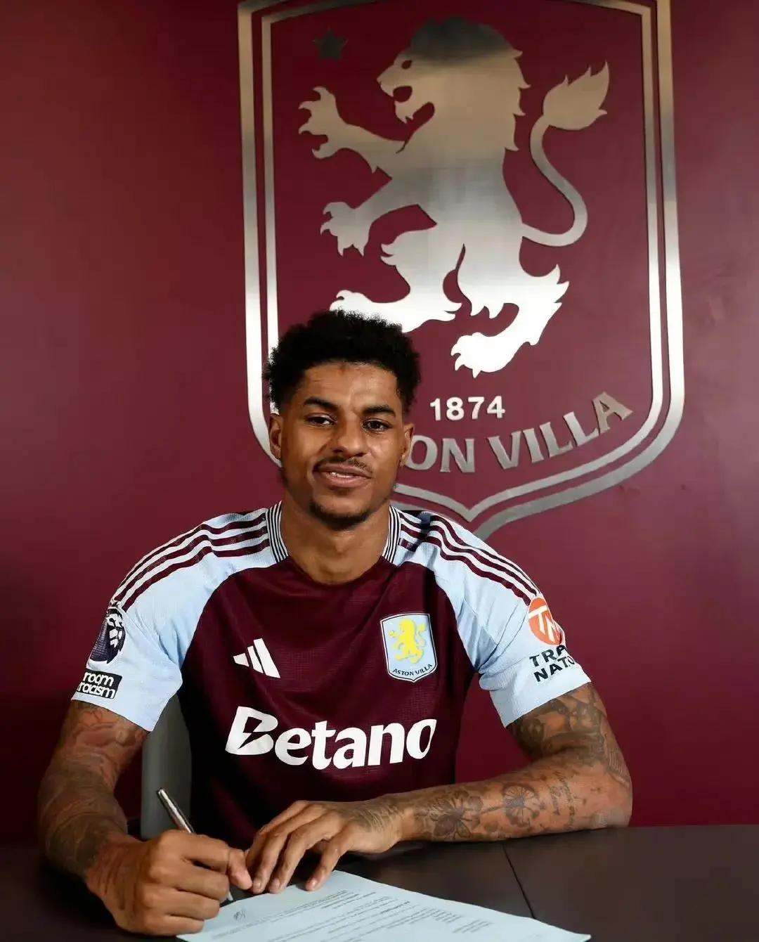 而曼联也在官宣了拉什福德租借加盟维拉的交易: