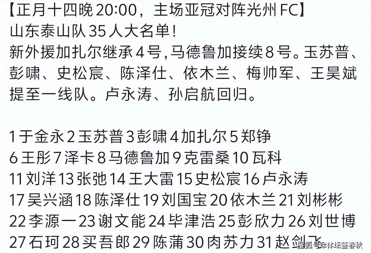 山东泰山与光州FC的亚冠小组赛第七轮,将在下周开踢。根据亚足联的要求,泰山俱乐部提前完成了球员名单的更新工作。此次调整,离队的外援马赛尔被撤下,新加盟的两名巴西外援马德鲁加和卡扎尔被补充进大名单。