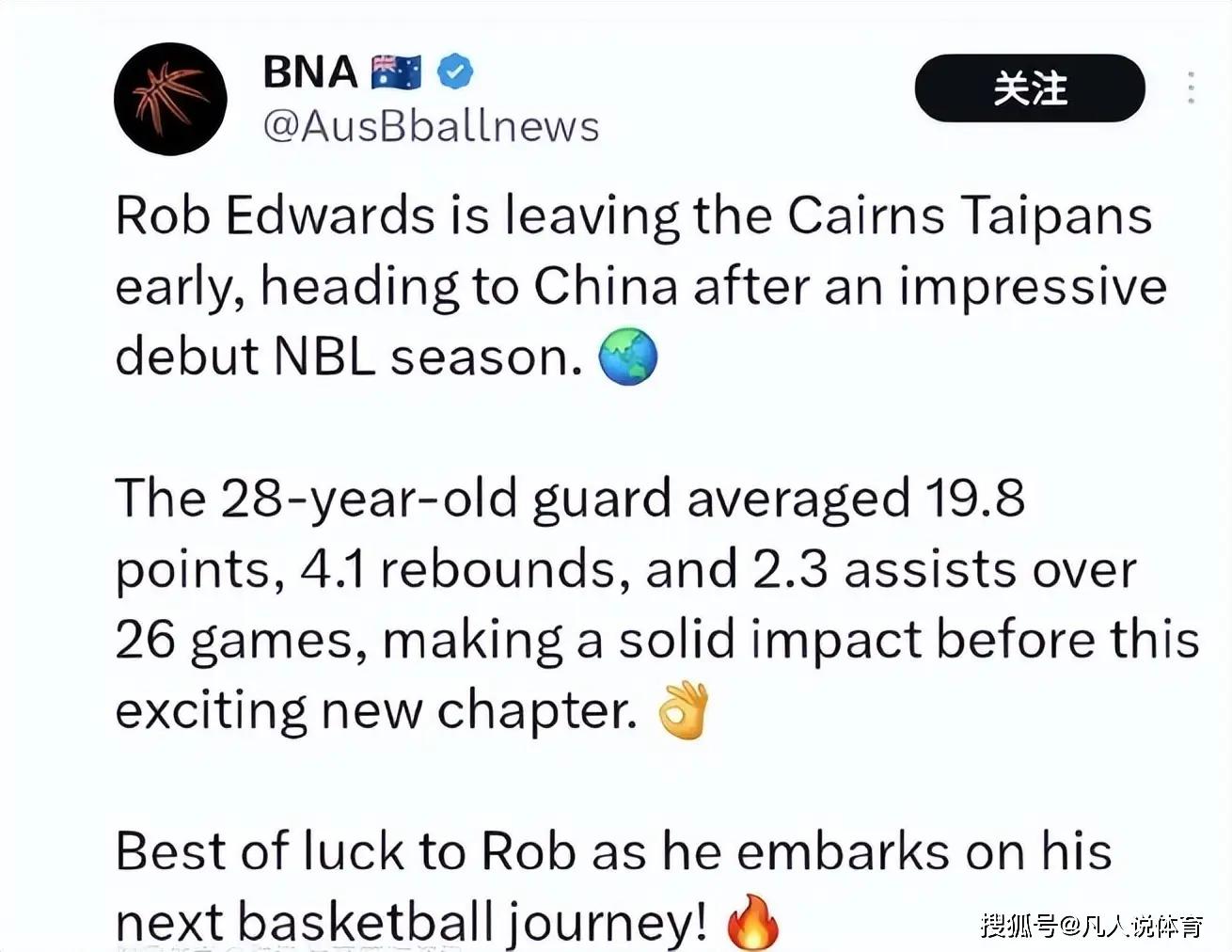 中国篮球圈再掀引援波澜!北京时间2月3日,据澳大利亚媒体BNA及国内知名媒体人"球圈赵探长"联合披露,效力于NBL坎斯大班毒蛇队的锋卫摇摆人罗伯·爱德华兹已与球队解约,目前抵达中国香港办理相关手续,即将披上新疆男篮战袍。这位26岁的得分机器本赛季以场均19.8分的统治级表现领跑NBL得分榜,他的加盟或将成为CBA季后赛版图重构的关键变量。