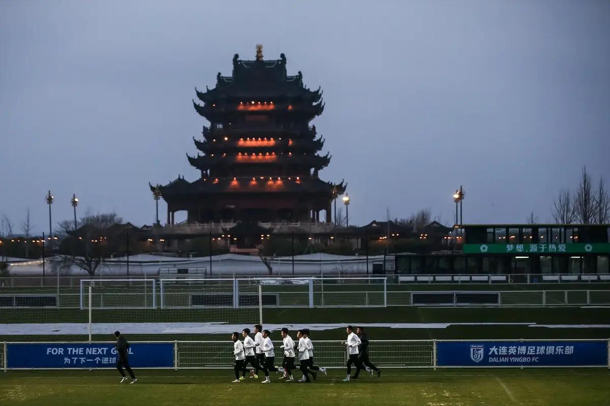 大连英博球员跑圈训练,背景的古塔建筑十分抢眼。上有天堂下有苏杭,江南春早,一年之计在于春,希望大连英博将士能在新春伊始时刻苦训练,在中超打出出色开局。