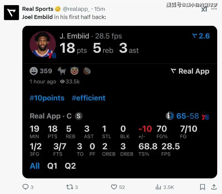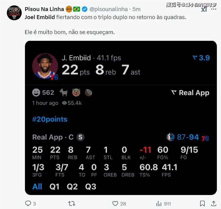 北京时间2月5日,NBA常规赛,费城76人以118-116击败达拉斯独行侠。这场比赛对于恩比德来说很重要,他已经整整休息了一个月,好在作为天才选手的大帝依旧有全面的身手,22秒关键球,5.1秒两罚一中,他拿到29+11+10的三双,他的右膝还是戴着厚厚的护具。