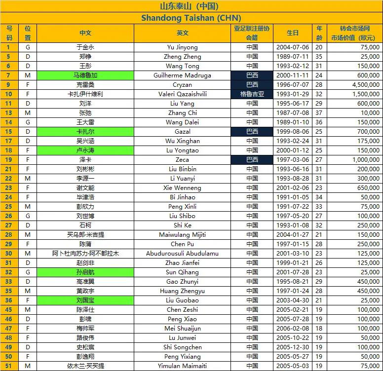 北京时间2月5日,德国转会市场中国区管理员朱艺发布最新的亚冠精英赛名单更新,山东泰山队进行了五名球员的调整,确认了两名新外援卡扎尔和马德鲁加的号码,同时本土球员卢永涛、孙启航和刘国宝也入选名单,而德尔加多、童磊、廖力生等人则被撤销报名。下一场比赛中,泰山队将于2月11日在主场迎战光州FC,而对手的名单调整更为明显,新增了11名球员,其中包括两名新外援,使得球队的外援总数增至四人。