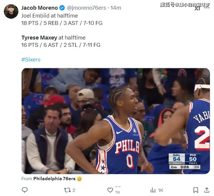 第二节马克西的效率依旧很高3中2拿到5分2篮板1助攻2抢断,半场打完马克西11中7拿到16分6助攻2抢断。恩比德半场10中7已经拿到18分5篮板3助攻。