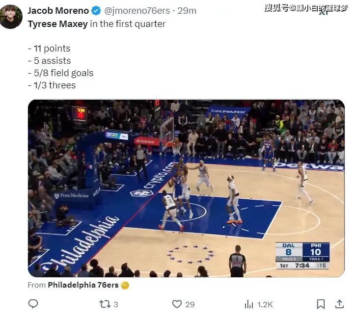 此役恩比德时隔一个月后复出,乔治继续缺席,马克西与恩比德的双核阵容攻防两端都会提升一些,不过马克西肯定才是主导,首节马克西的表现几近完美,单节8中5+三分3中1拿到11分5助攻1篮板,欧文首节12分3篮板1助攻,他与欧文形成对飙。