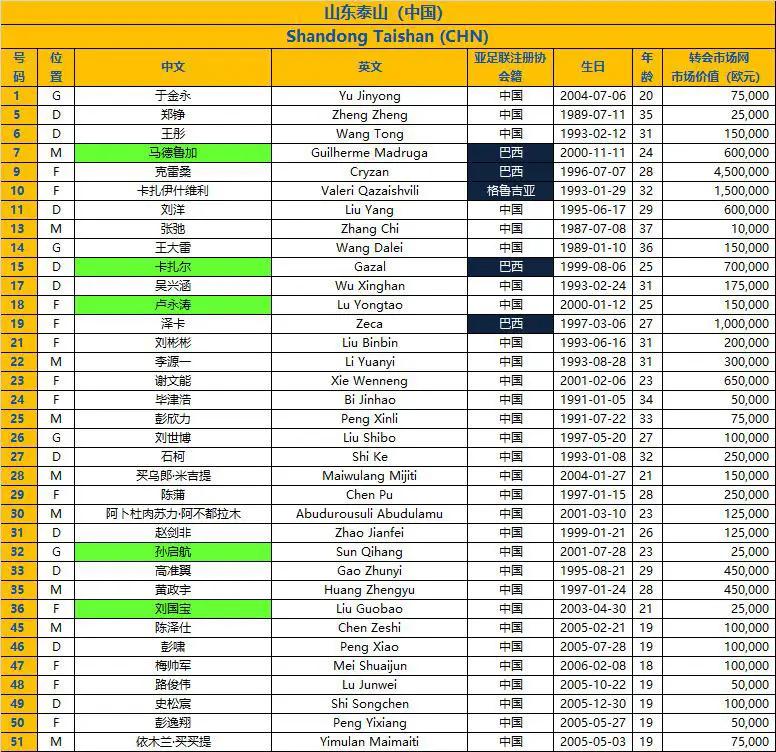 有意思的是,除了5名外援外,这份名单中包含30名本土球员,其中有22人出自鲁能青训。值得一提的是,马德鲁加也是来自鲁能巴西青训基地。这一高比例的青训球员占比在全球范围内都相当罕见,这也反驳了那些认为泰山队不重视自家青训球员的说法。