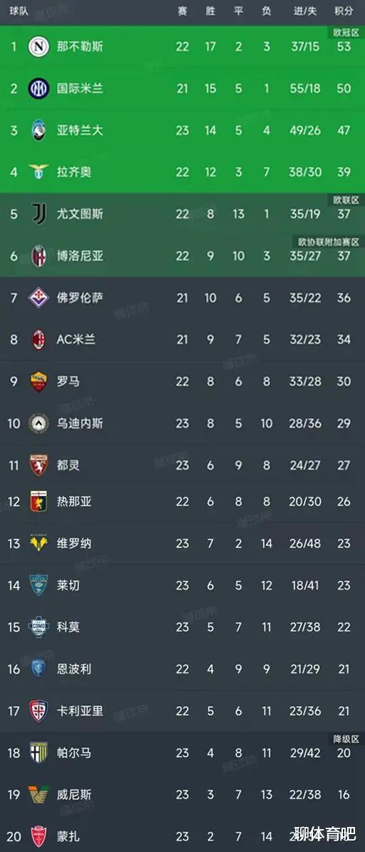 北京时间2月2日,意甲第23轮率先结束了5场对决,我们一起看看积分榜的变动,主要的信息如下:亚特兰大1-1都灵,博洛尼亚2-0科莫,乌迪内斯3-2威尼斯,蒙扎0-1维罗纳、帕尔马1-3莱切。