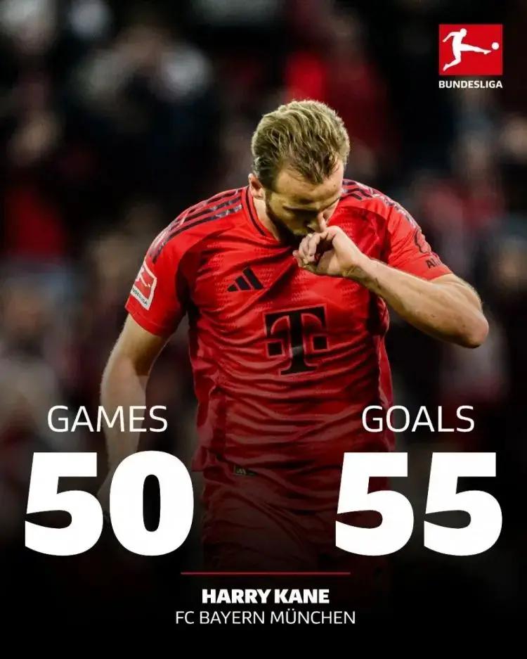 尽管条款存在,凯恩在本赛季冬窗并未采取行动。据多方报道,他在慕尼黑的适应远超预期:竞技层面,凯恩延续了高效表现,首个德甲赛季(23/24)打入36球,本赛季更是在第50场德甲比赛中攻入第55球,创下联赛历史同期最高效率。生活层面,他与家人已完全融入当地社区,私人生活的稳定成为留队的关键因素。